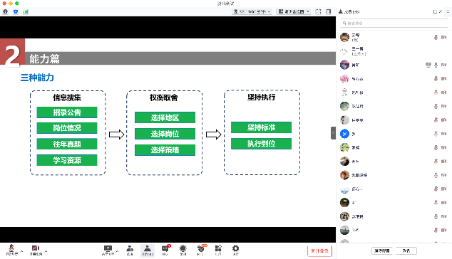 巨雯雯主要从考试经历、考前准备、笔面试备考以及工作现状等方面分享了个人求职的感受。肖昕从个人考公经历的心路历程、公务员岗位的选择、能力要求以及笔试面试的备考技巧等方面进行了详细的解读。两位优秀员工用具体实例结合自身的亲身经历给大家提供合理备考的建议,广大研究生对公务员考试的笔试面试内容、备考方式等有了更为深入的了解,同学们对自己的职业规划有了更明晰的认知。
