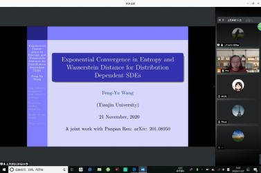 11月27日上午,国家杰出基金获得者、长江特聘教授王凤雨教授受邀为best365英国体育在线师生带来了一场题为:“Exponential Convergence in Entropy and Wasserstein Distance for Distribution Dependent SDEs ”的学术报告。本报告介绍了分布相关随机微分方程熵和Wasserstein距离的指数收敛性。