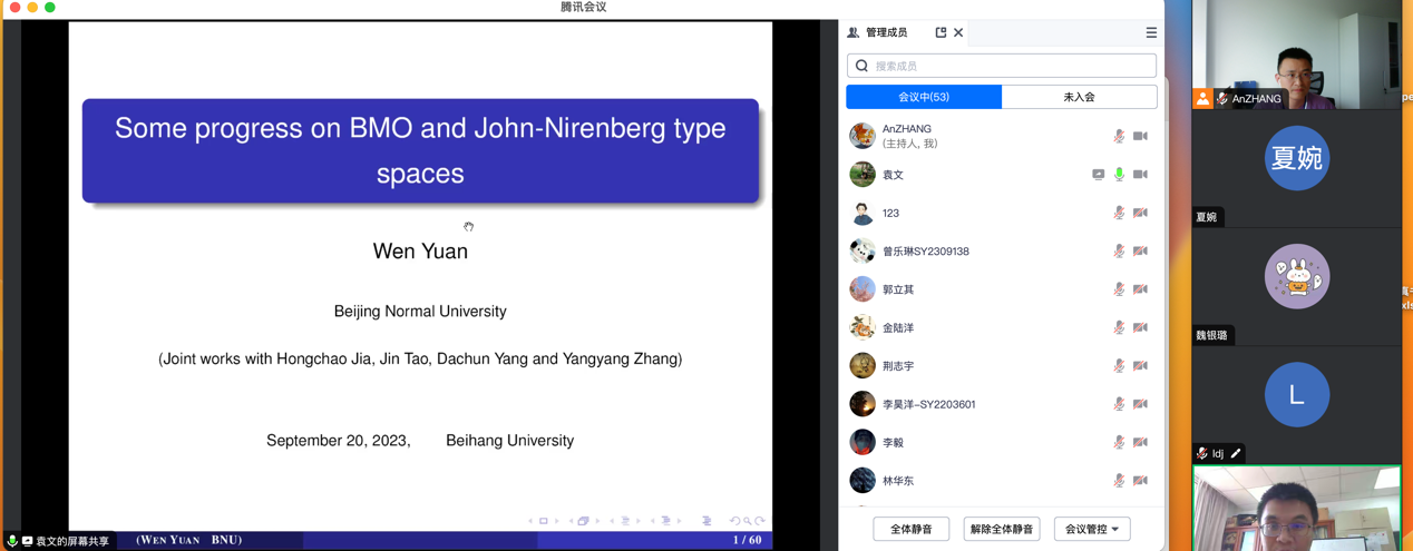 本次报告,袁老师介绍了BMO和广义的John-Nirenberg空间方面最新的进展。BMO 和 John-Nirenberg空间最早是由数学家John 和Nirenberg 在1961年引入的,后来70年代 Stein-Fefferman 给出了BMO 和Hardy 空间H^1的对偶原理。而一般的JN空间具有更加复杂的结构,很多问题长期没有解决,本次报告介绍了该领域最新的相关进展。