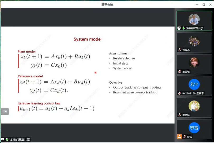 报告首先简要概述了迭代学习控制方法及随机衰减信道的建模,给出了随机衰减信道作为一类不完备信息所带来的控制设计与分析问题。其次,报告将分衰减信道统计信息分为已知和未知两个方面,具体介绍了相关工作。在衰减信道统计信息已知的情形,沈教授主要介绍了围绕输入信号波动所引发的问题,以及采用平均算子的相关结果。在衰减信道统计信息未知的情形,沈教授主要介绍了针对未知信息的迭代估计方法与非迭代估计方法。在报告最后,参会师生与沈教授进行了积极的交流和探讨。