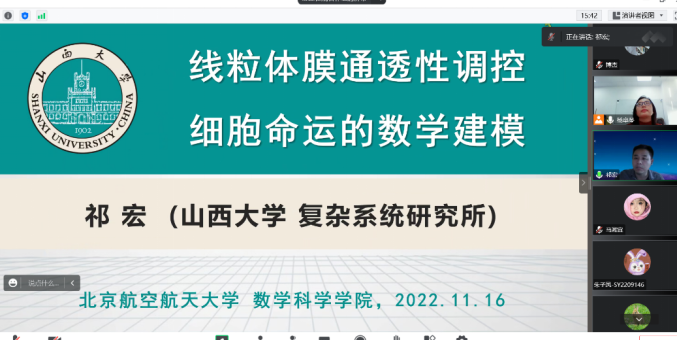 2022年11月16日下午,应用数学系杨卓琴老师邀请山西大学复杂系统研究所祁宏副教授,进行了有关“线粒体膜通透性调控细胞命运的数学建模”的线上学术报告。报告进行了两个多小时,公司近30名教师和研究生参会。祁宏老师详细地介绍了研究成果的生物背景、研究方法、创新结果及未来工作设想等,并且非常耐心地回答了同学们提出的各种学术问题。