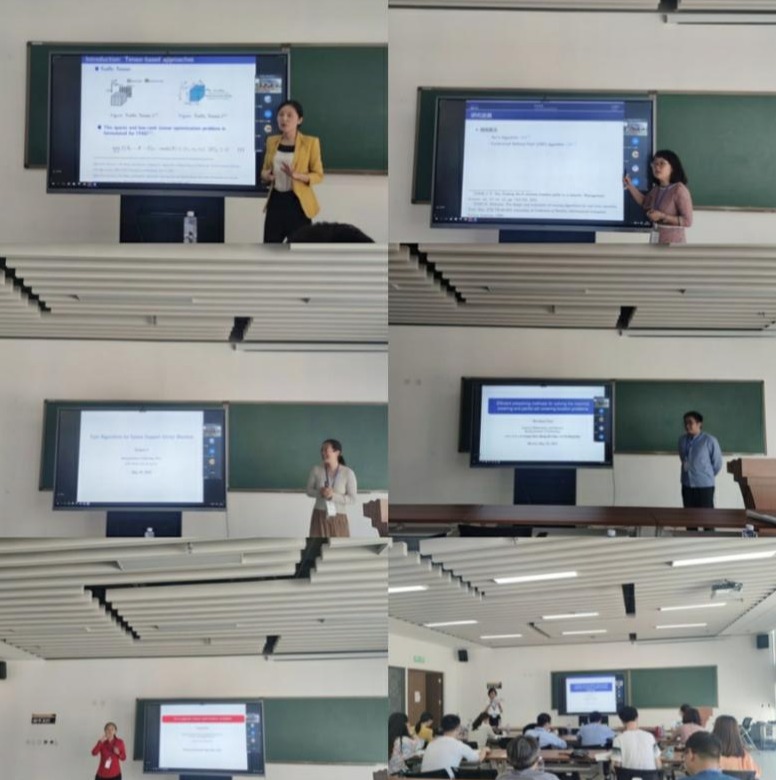 上午的报告人有中国科公司数学与系统科学研究院刘歆研究员和刘亚锋副研究员、中国科公司大学韩丛英教授、清华大学张立平副教授。刘歆研究员以主成分分析为背景,介绍了一种低秩矩阵分解的安全的分布式算法,该算法具有较低的通讯代价;韩丛英教授针对组合优化中的背包与选址问题,提出了一种深度强化学习算法,其对背包问题具有很强的时间优势;刘亚锋副研究员报告了在通讯用户数量变多的背景下,大规模MIMO检测的理论和算法;张立平副教授报告了四元数的三阶张量相关内容,通过对此类张量做低秩奇异值分解可以分析和处理彩色视频。