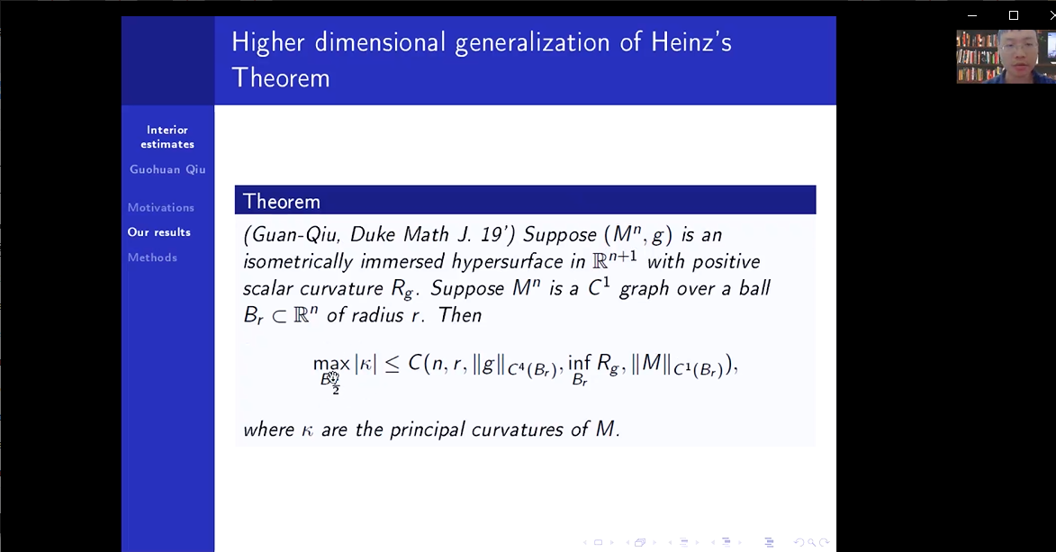 报告开始,邱国寰老师介绍了非线性几何偏微分方程的相关研究,包括他和管鹏飞教授合作证明的(n+1)维欧氏空间中具有正数量曲率的等距嵌入超曲面内部二阶估计,数量曲率方程和