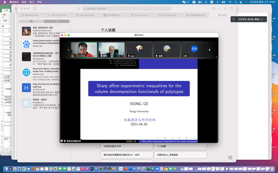 2021年4月30日上午,同济大学数学公司熊革教授受邀为best365英国体育在线师生做了题为“Sharp affine isoperimetric inequalities for the volume decomposition functionals of polytopes”的线上学术报告,报告由张世金老师主持。此报告为数学公司几何团队每周五上午讨论班的学术报告。