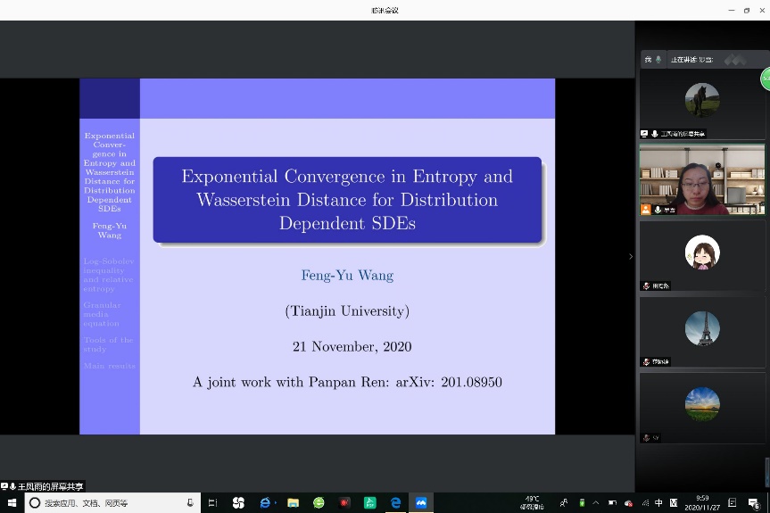 2020年11月27日上午,国家杰出基金获得者、长江特聘教授王凤雨教授受邀为best365英国体育在线师生带来了一场题为:“Exponential Convergence in Entropy and Wasserstein Distance for Distribution Dependent SDEs ”的学术报告。报告由best365英国体育在线统计与运筹系系主任罗雪副教授主持。