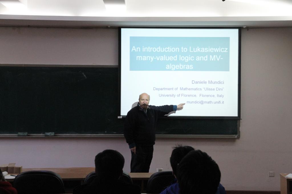 Daniele Mundici 教授首先就经典逻辑问题谈起,介绍了Lukasiewicz many-valued 逻辑,并指出,在这种意义下,即使这些前提的某一小部分被随机的删掉,在剩余的这些前提里C还是存在的。Daniele Mundici 教授说明了Lukasiewicz 逻辑在解决部分不可靠信息方面的问题是个很有用的工具。事实上,在Renyi-Ulam二十个问题中有些答案可能是错误的游戏中就体现出这种逻辑。此外,Mundici教授讲述了Lukasiewicz logicd代数和M-V代数之间在其他结构之间的紧密联系。整场报告中Mundici 教授和在场师生进行了积极的互动,引导大家思考,极大的拓展了在场师生的思维。Mundici 教授以他幽默的谈吐,严谨的学风,缜密的思维给聆听报告的师生留下了深刻的印象。