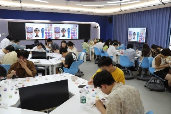 在李大冬老师的指导下,师生们热情高涨地投入到点蓝的实际操作中。大家用小铲或吸管,将珐琅釉料依次填入焊好的铜丝纹饰框架中,体验这门古老技艺的精妙之处。尽管制作过程繁琐,但师生们表现出了极大的耐心和创意,最终完成了一件件独具匠心的景泰蓝作品。