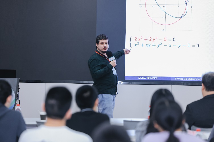 法国国家信息与自动化研究所Matias Bender助理研究员主讲《使用行列式公式解决多项式系统问题》报告,介绍了符号-数值算法使用代数几何技术将问题简化为线性代数问题的思想方法,并展示了解决结构化多项式系统问题的高效算法。