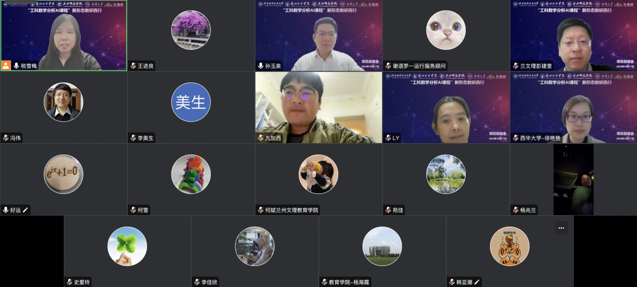 经过精心筹备,于2024年10月17日,四校联合举行“工科数学分析AI课程”教研西行项目启动会议。本项目是“慕课西部行”活动中北京首个以AI课程开展新形态教研西行的项目,四校教师团队通过“智慧树”平台云端相聚,共享共创,交流互通。