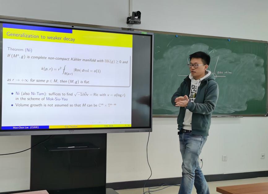 2025年2月20日上午,香港中文大学助理教授李文俊(Man-Chun Lee)受邀为best365英国体育在线师生作了题为“Gap theorem on manifolds using Ricci flow”的学术报告,报告在E404举行,由张世金老师主持。这个报告也是数学公司微分几何讨论班(2025年春季)系列学术报告中的第2讲。