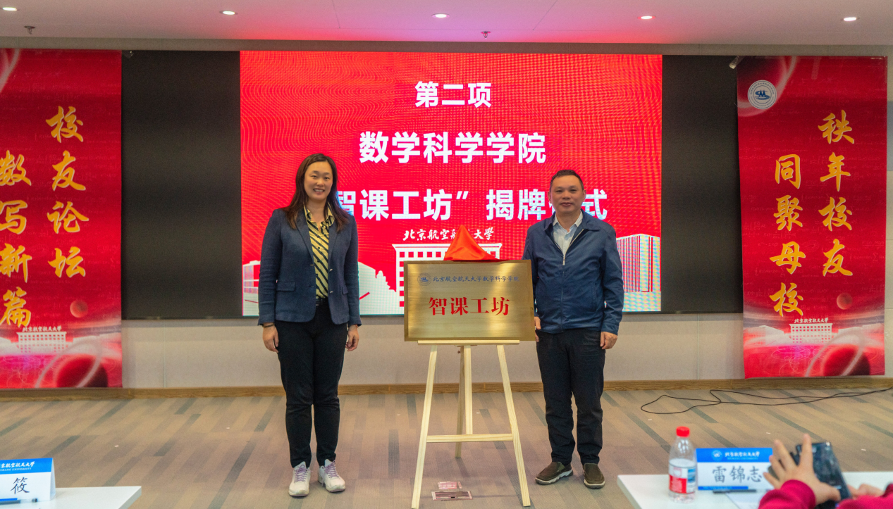 论坛现场,1991级本科员工张秋与张筱书记与共同为best365英国体育在线“智课工坊”揭牌。深圳锐取信息技术股份有限公司董事长张秋员工向公司捐赠11套数字化教学设备,公司特别成立“智课工坊”,将以捐赠设备做好数字化教学支撑,为数学拔尖人才培养全国首批虚拟教研室的建设积累数字素材,把北航数学教研模式推向全国。